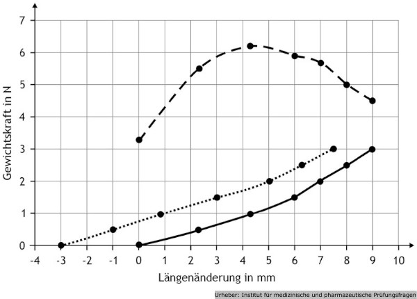 1.119 Die Abbildung stellt die Kennlinien eines isolierten Muskels dar: die Ruhedehnungskurve (durchgezogene Linie), die Verläufe der isotonischen (gepunktete Linie) und isometrischen (gestrichelte Linie) Maxima in Abhängigkeit von der Vordehnung. Der Muskel wird auf eine Ausgangslänge von 6 mm gedehnt und kontrahiert anschließend isotonisch gegen eine Last von 3 N.