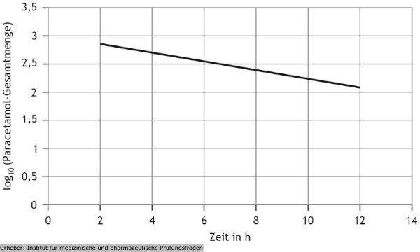 1.13 Die Elimination von Paracetamol verläuft im Körper näherungsweise nach einer Kinetik 1. Ordnung. Im Diagramm ist die Paracetamol‑Gesamtmenge im Plasma über einen Zeitraum von 12 h dargestellt. Die erste Messung erfolgte 2 h nach abgeschlossener Resorption. Auf der Ordinate (y‑Achse) ist der dekadische Logarithmus der Paracetamol‑Gesamtmenge (in mg) aufgetragen.