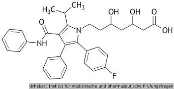 1.17 Die Abbildung zeigt die chemische Struktur von Atorvastatin, einem Mitglied der HMG‑CoA‑Reduktase‑Inhibitoren, die in der Behandlung von Hypercholesterinämie verwendet werden.