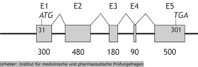 1.54 Die dargestellte Abbildung veranschaulicht den Aufbau eines proteinkodierenden Gens mit den Exons E1 bis E5. Zusätzlich sind die Nucleotidanzahl pro Exon sowie die Lage von Start- und Stoppcodon angegeben.