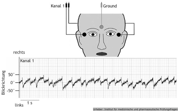 1.90 Im Rahmen einer vestibulären Funktionsprüfung wird bei einer gesunden Versuchsperson durch Spülung eines Gehörgangs mit Wasser unterschiedlicher Temperatur ein Nystagmus induziert. Dargestellt ist die horizontale Ableitung des Nystagmus.