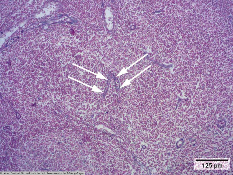 2.29 Die dargestellten Abbildungen zeigen ein lymphatisches Organ in verschiedenen Vergrößerungsstufen, wobei eine特定的 Struktur jeweils mit Pfeilen gekennzeichnet ist. In welchem der folgenden lymphatischen Organe ist das Auftreten dieser markierten Struktur am unwahrscheinlichsten?