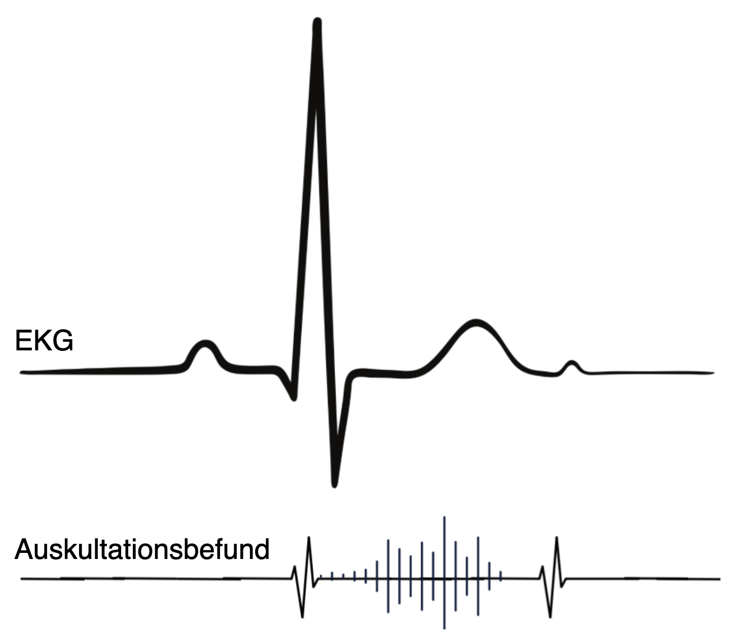 1.113 Bei einem Patienten werden zeitgleich ein Elektrokardiogramm (EKG) und eine digitale Herzschallaufnahme (Phonokardiogramm) durchgeführt. Die resultierende synchrone Darstellung der Kurvenverläufe zeigt die folgende Abbildung: