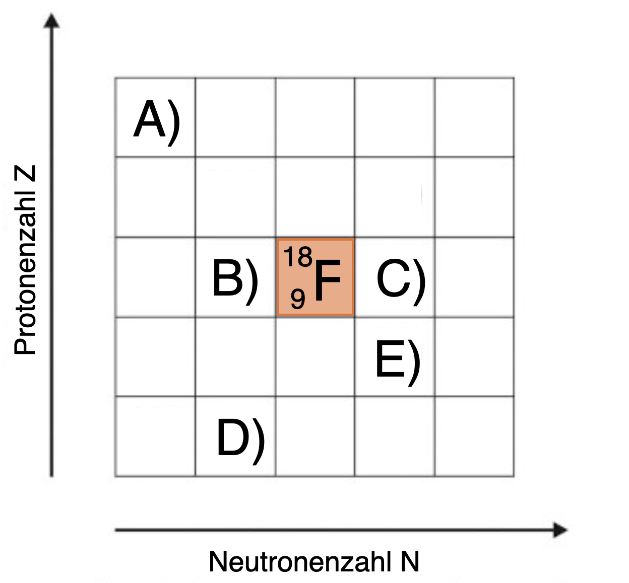1.17 In der dargestellten Nuklidkarte ist das $\beta^+$‑strahlende Nuklid $F_{9}^{18}$ markiert. Hierbei ändert sich in benachbarten Zeilen die Neutronenzahl und in benachbarten Spalten die Protonenzahl jeweils um 1. Welcher Bereich (A)–(E) dieser Grafik entspricht dem Tochternuklid nach dem $\beta^+$‑Zerfall von $F_{9}^{18}$?