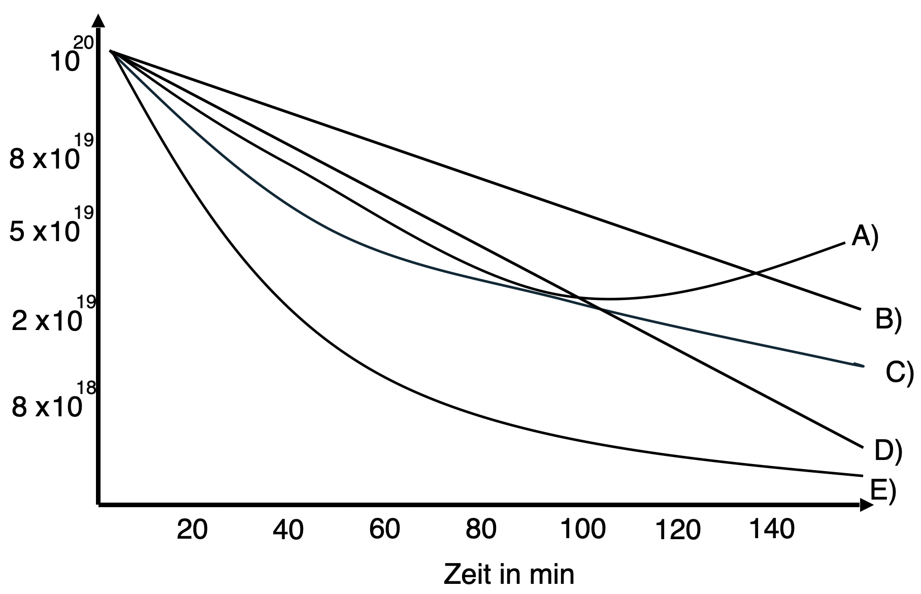 Welche der abgebildeten Kurven (A)–(E) stellt den am wahrscheinlichsten zu erwartenden zeitlichen Verlauf der Anzahl der noch nicht zerfallenen Kerne dar?