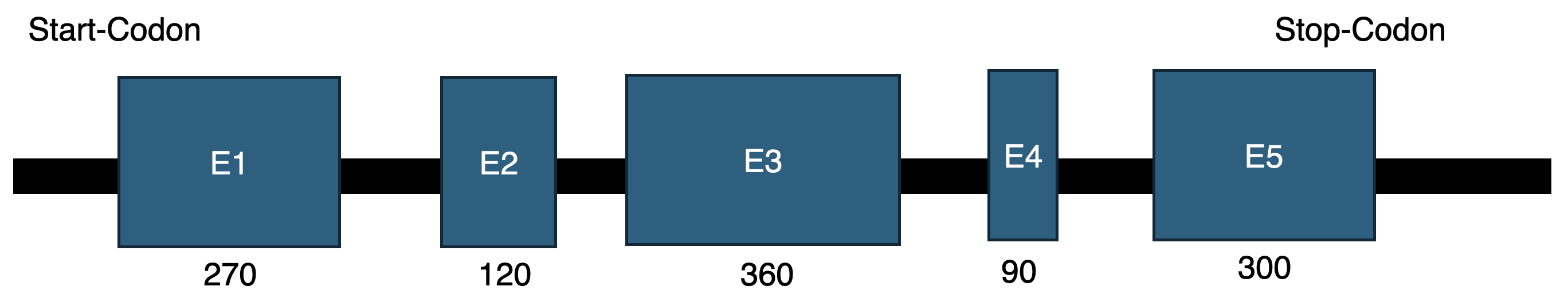 1.57 Die Abbildung zeigt den Aufbau eines proteinkodierenden Gens mit den Exons E1 bis E5. Dabei sind sowohl die Nucleotidanzahl für jedes Exon als auch die Positionen von Start- und Stoppcodon angegeben. Durch alternatives Spleißen wird ein Protein synthetisiert, das um 120 Aminosäuren kürzer ist als das ursprüngliche. Welches Exon wird im Rahmen dieses Prozesses ausgespart?