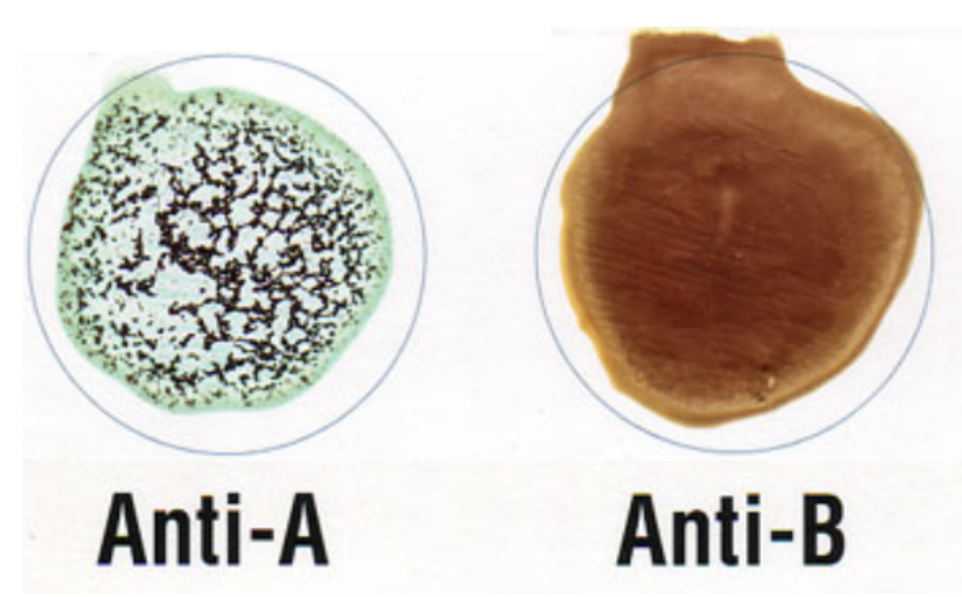 1.69 In einem Labor wird während einer Routineblutabnahme ein Schnelltest durchgeführt, um die AB0-Blutgruppe einer Probe zu bestimmen. Dazu wird die Probe auf eine Prüfplatte mit zwei Feldern aufgebracht. Ein Feld enthält Antikörper gegen Blutgruppen-A-Merkmale (Feld „Anti-B“), das andere gegen Blutgruppen-B-Merkmale (Feld „Anti-A“). Nach Durchführung zeigt sich Agglutination im Feld „Anti-B“, nicht jedoch in „Anti-A“.
