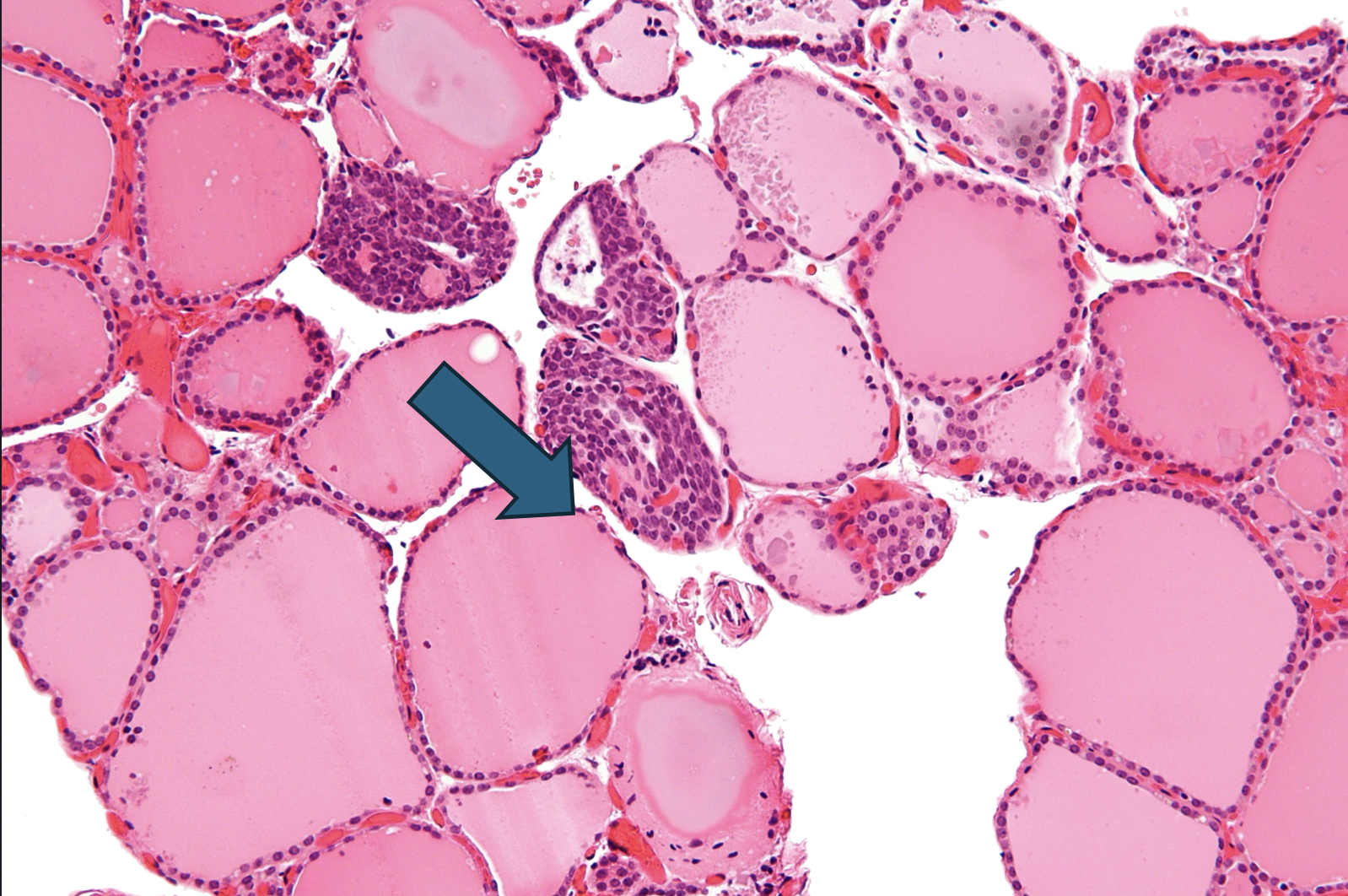 2.77 Das dargestellte histologische Bild zeigt markierte Zellstrukturen in einer Drüse.