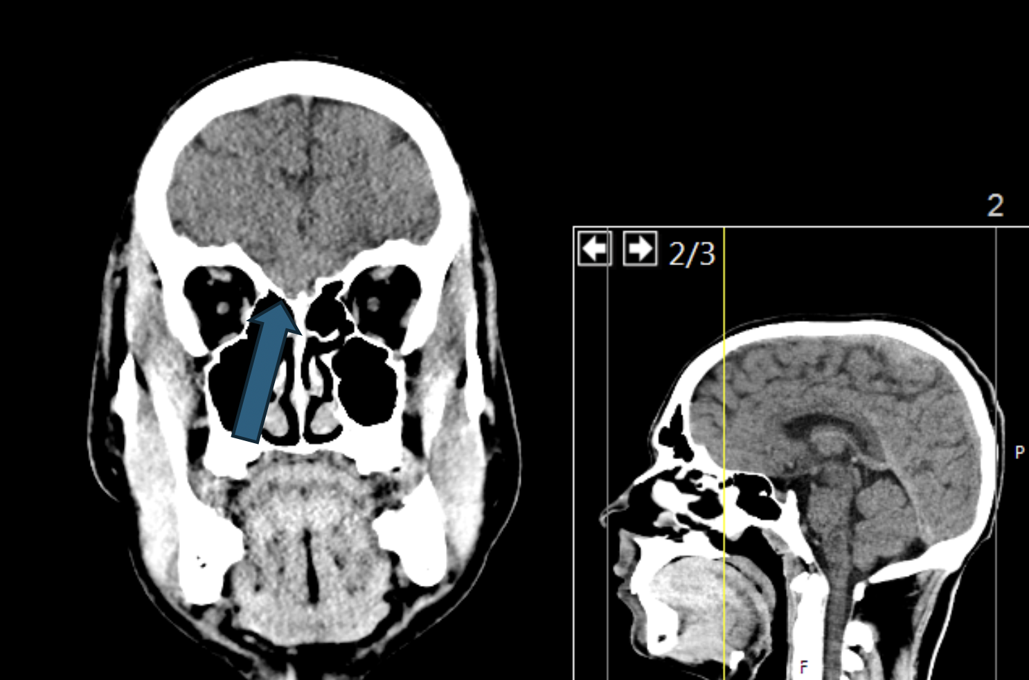 2.90 In der abgebildeten frontalen CT-Schicht des menschlichen Schädels markiert ein weißer Pfeil eine bestimmte anatomische Struktur. Welche der folgenden Hirnareale stellt das primäre Ziel der Projektionen der Neurone bzw. Axone dar, die in diesem markierten Bereich lokalisiert sind?