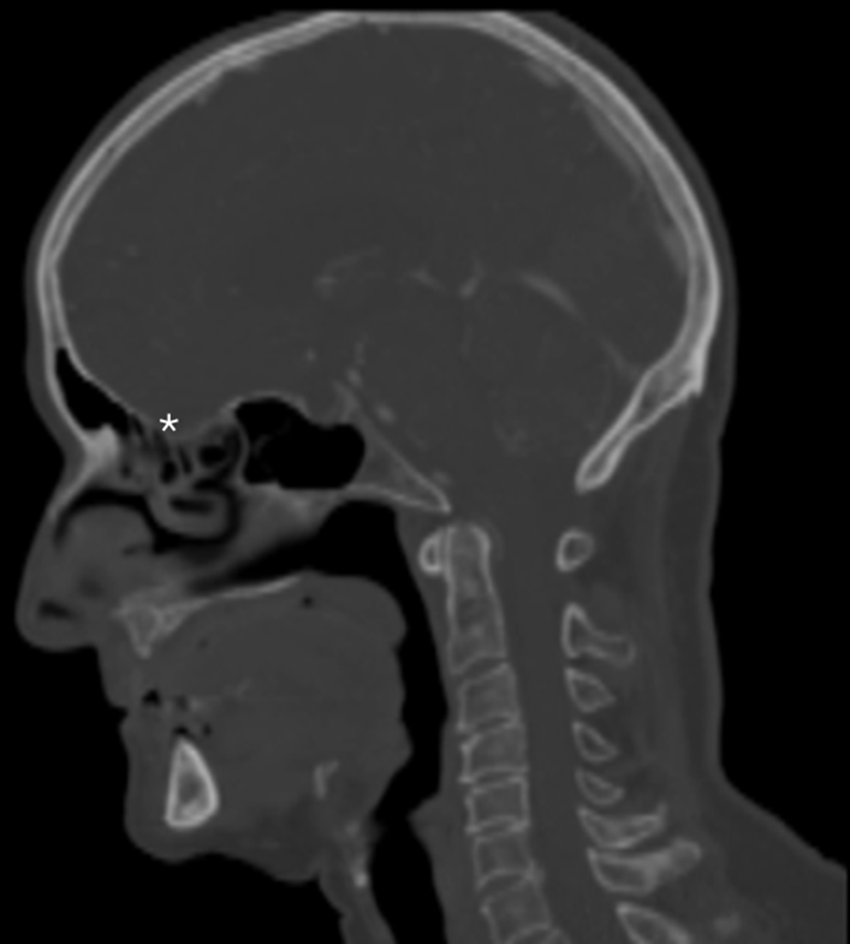 2.108 In einer radiologischen Darstellung (Sagittalschnitt) des Schädels ist ein weißer Stern im Bereich der vorderen Schädelgrube direkt über dem Dach der Nasenhöhle platziert. Welche anatomische Struktur wird durch diesen Stern markiert und welcher Nerv befindet sich da?