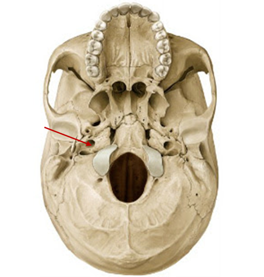 2.109 In der folgenden Abbildung zeigt sich mit einem roten Pfeil gekennzeichnet eine Öffnung, durch die eine Arterie durchläuft. Welches Gefäß wird von dieser Arterie im weiteren Verlauf abgegeben?