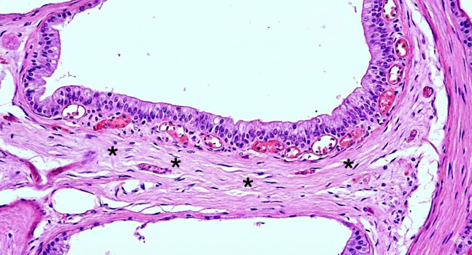 2.114 In der histologischen Abbildung ist eine Schicht zu erkennen, die der knöchernen Wand der Schnecke direkt anliegt. Auf welche Struktur wird hier mit einem schwarzen Stern verwiesen?