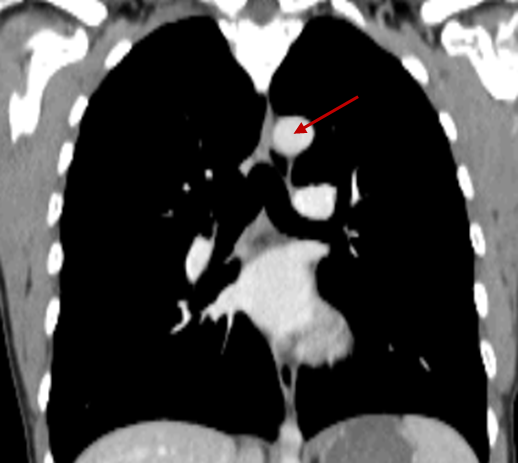 2.147 Zu sehen ist ein CT-Thorax. Welche der folgenden Strukturen wird hier mit dem roten Pfeil dargestellt?