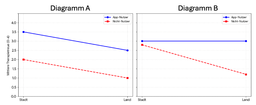 - (A) Diagramm A zeigt eine Interaktion, da App-Nutzer generell höhere Werte haben als Nicht-Nutzer.